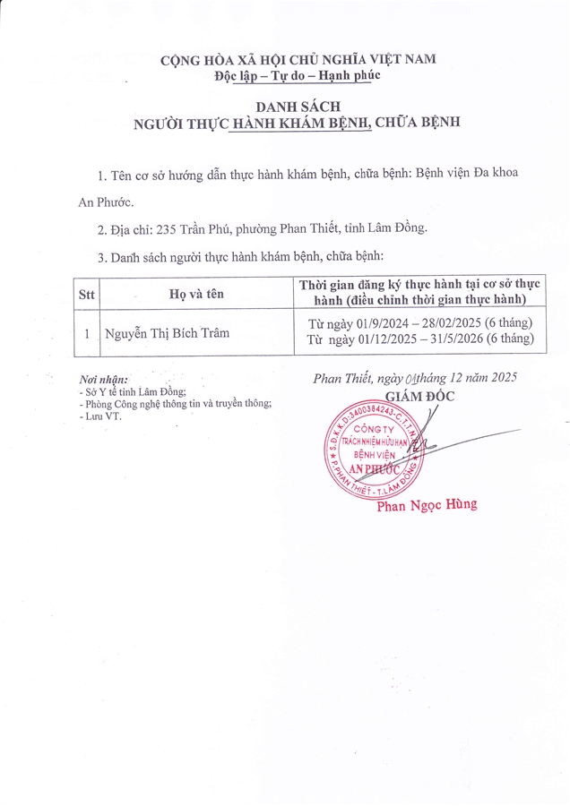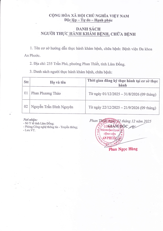 BỆNH VIỆN ĐA KHOA AN PHƯỚC Địa chỉ: 235 Trần Phú, phường Phan Thiết, tỉnh Lâm Đồng, Việt Nam Tel: (0252) 3 831.056 Hotline Chăm sóc khách hàng: (0252) 3 819 819 Fax: (0252) 3 831.057 Facebook: benhvienanphuocbinhthuan (Bệnh viện) Facebook: phongkhamanphuoclagi (Phòng khám Đa khoa An Phước - La Gi) Email: info@anphuochospital.com Copyright © 2002-2016 Bản quyền thuộc về Bệnh viện AN PHƯỚC Thiết kế bởi Tính Thành