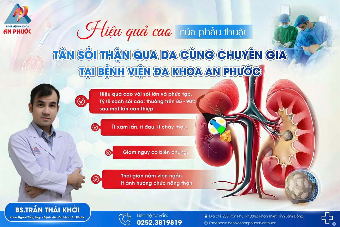 BỆNH VIỆN ĐA KHOA AN PHƯỚC Địa chỉ: 235 Trần Phú, phường Phan Thiết, tỉnh Lâm Đồng, Việt Nam Tel: (0252) 3 831.056 - (0252) 3 831.057 Hotline Chăm sóc khách hàng: (0252) 3 819 819 Cấp cứu: 0908 551 115 Facebook: benhvienanphuocbinhthuan (Bệnh viện) Facebook: phongkhamanphuoclagi (Phòng khám Đa khoa An Phước - La Gi) Email: info@anphuochospital.com Copyright © 2002-2016 Bản quyền thuộc về Bệnh viện AN PHƯỚC Thiết kế bởi Tính Thành